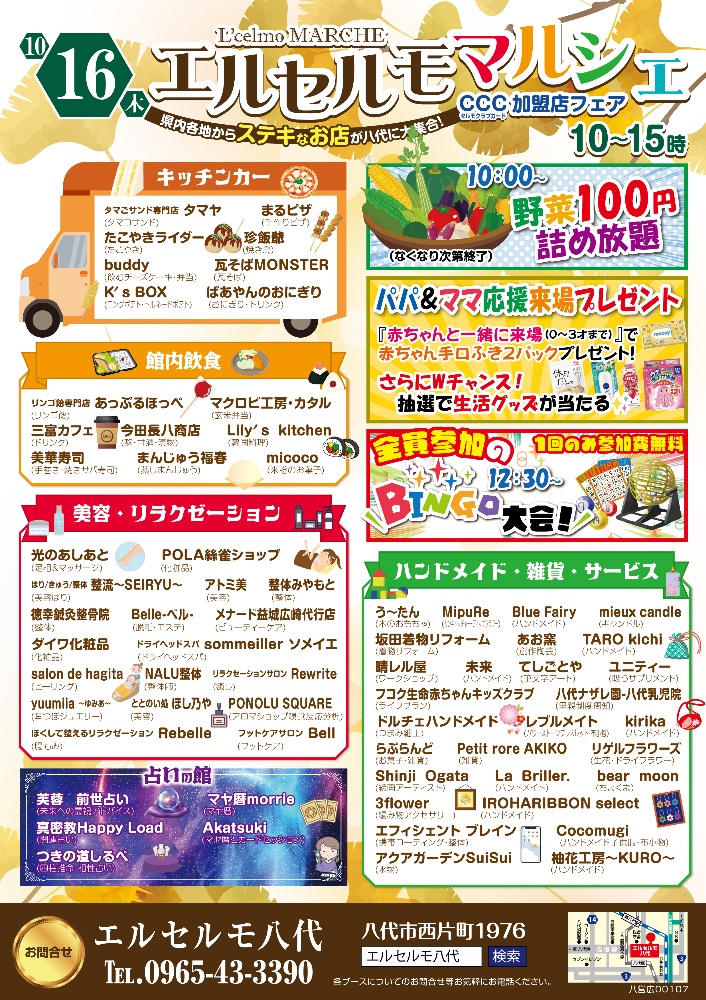 #エルセルモマルシェ #八代イベント #親子でおでかけ #野菜詰め放題 #ビンゴ大会 #キッチンカーグルメ #ハンドメイド雑貨 #リラクゼーション #占い体験